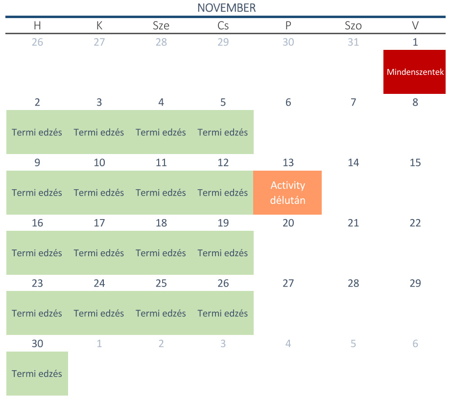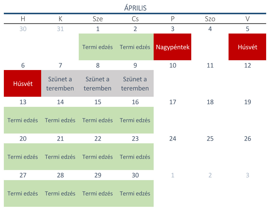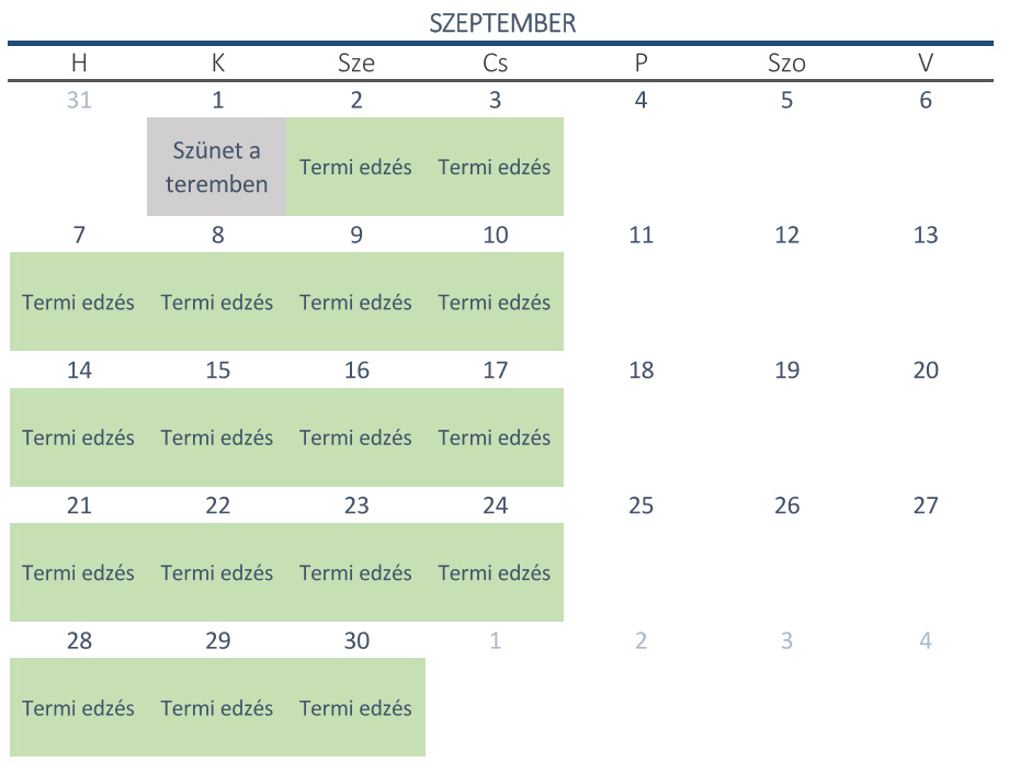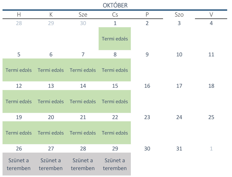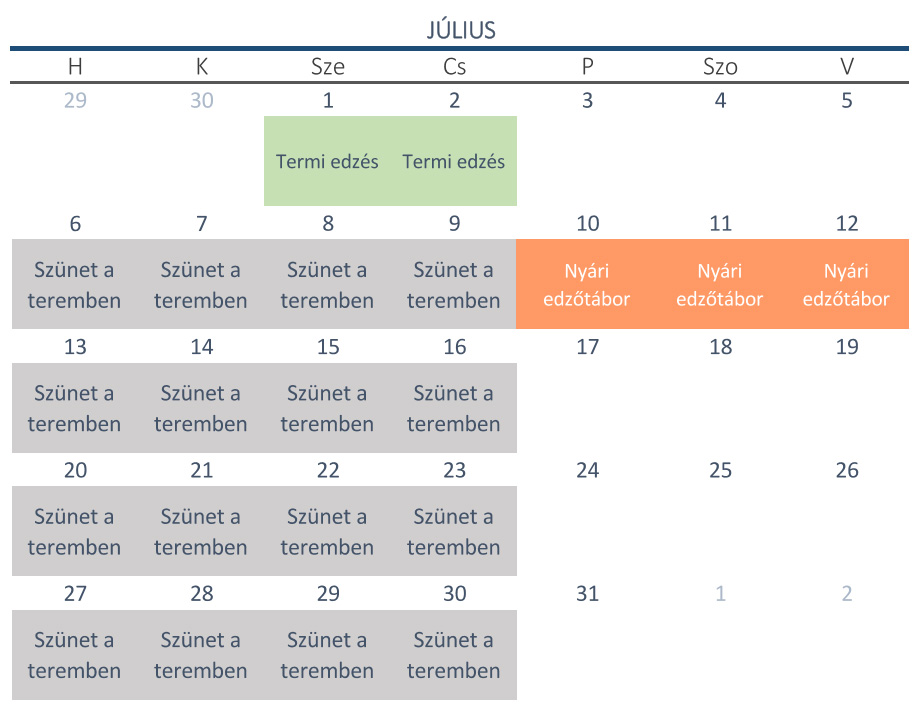 A szürkével jelölt napokon szünetelnek az edzések a teremben.