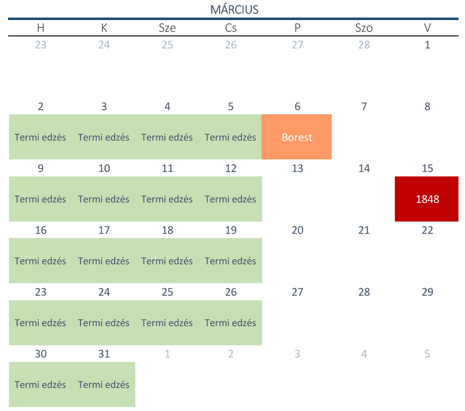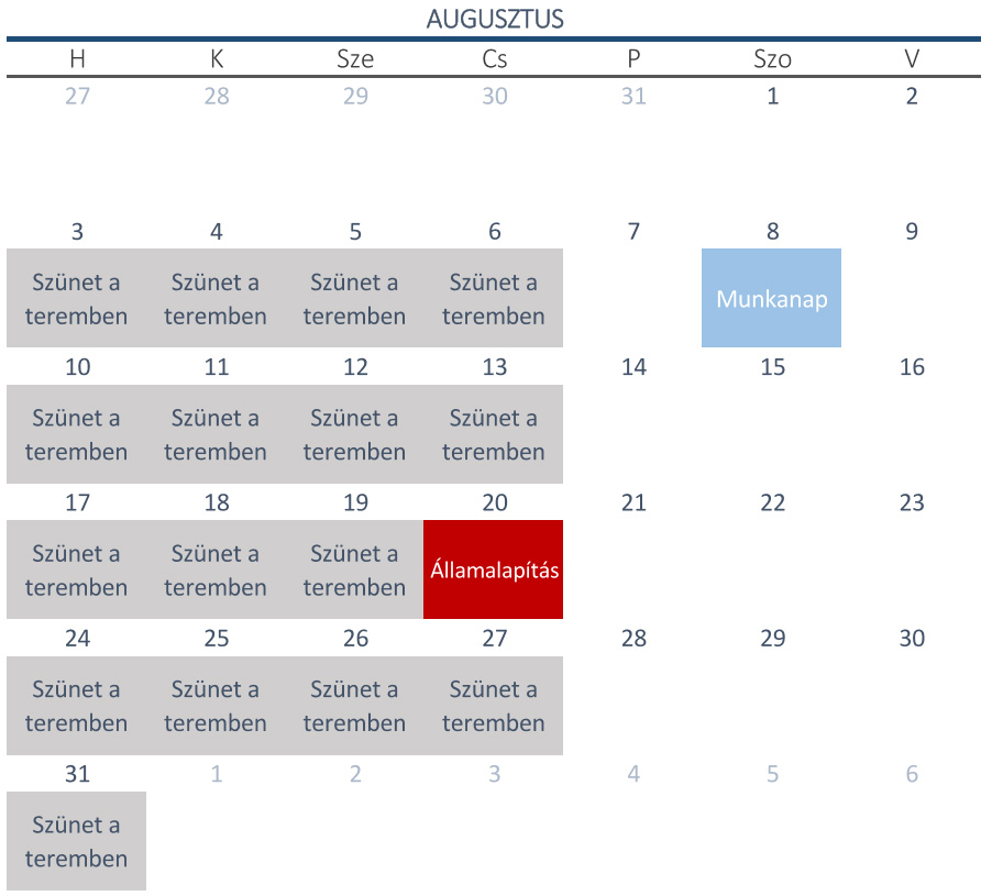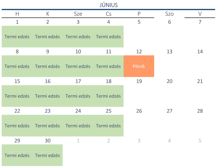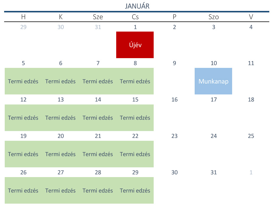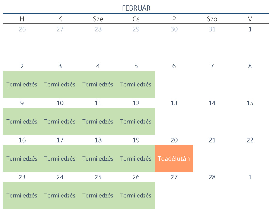 A szürkével jelölt napokon szünetelnek az edzések a teremben.